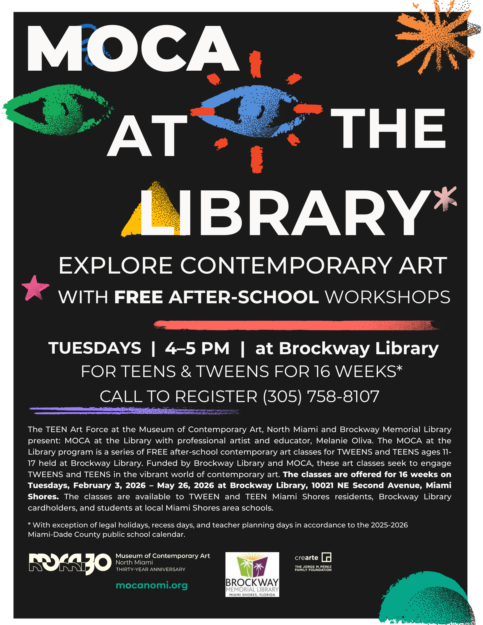 The TEEN Art Force at the Museum of Contemporary Art and Brockway Memorial Library present: MOCA at the Library with professional artist and educator, Melanie Oliva. The MOCA at the Library program is a 16-week series of FREE after-school contemporary art classes on Tuesdays for TEENS and TWEENS ages 11-17 held at Brockway Library.